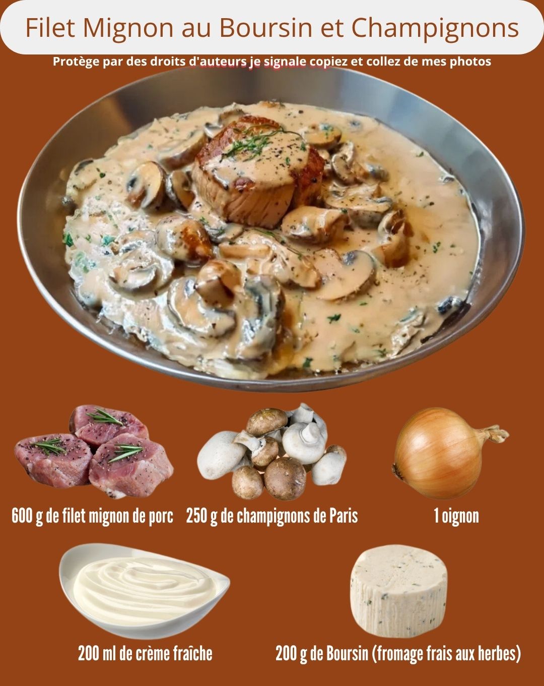 🔸 Ingrédients Pour le plat : 600 g de filet mignon de porc(Choisis un filet bien rosé et ferme, sans trop de nerfs.) 200 g de Boursin (fromage frais aux herbes)→ Apporte onctuosité et parfum. 250 g de champignons de Paris(Fraîchement nettoyés, jamais lavés à grande eau pour éviter qu’ils se gorgent d’eau.) 1 oignon … Read more
