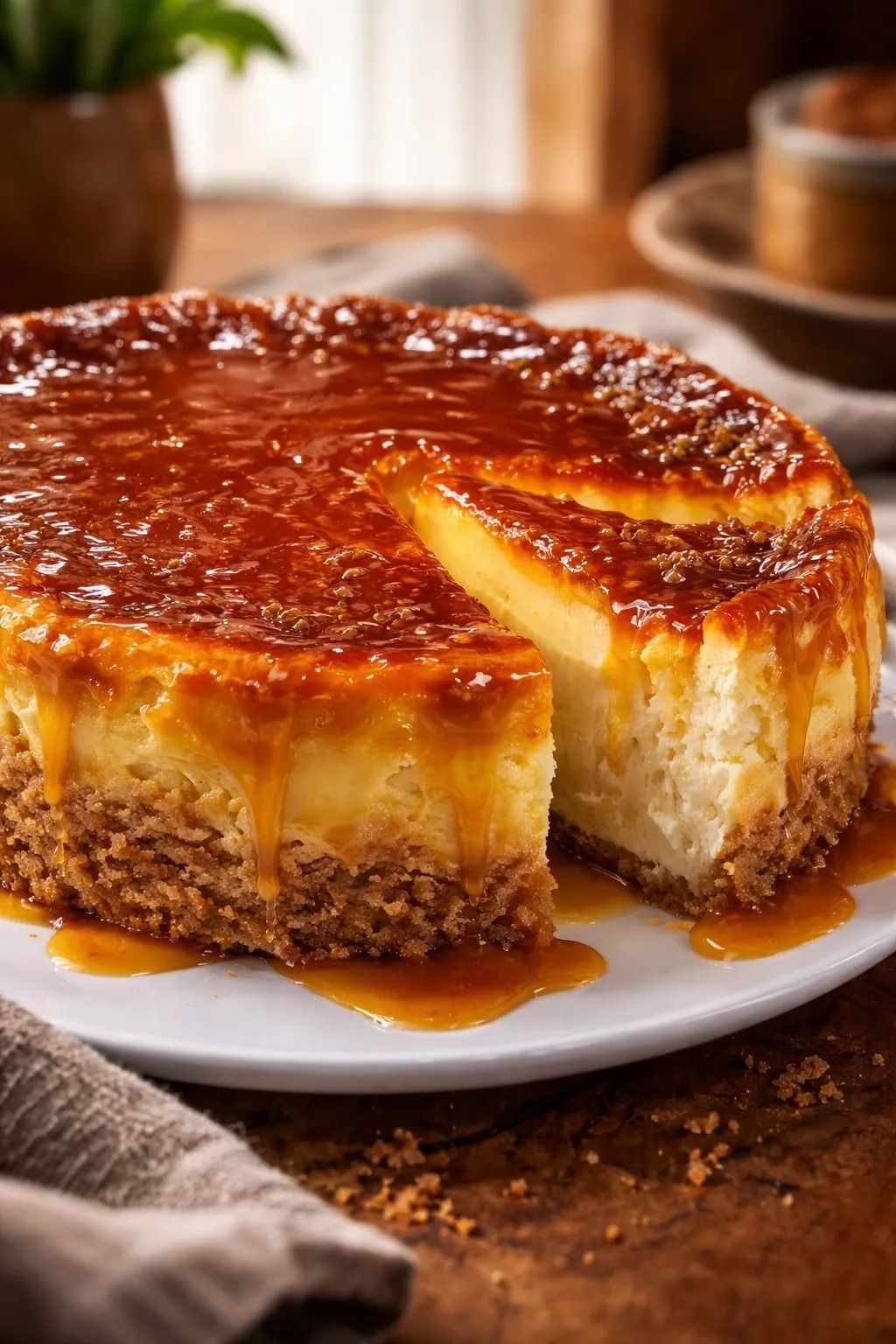 Ce cheesecake met en valeur la douceur du fromage frais et la profondeur du caramel. La base biscuitée apporte une touche croquante, tandis que la garniture fondante et le nappage doré créent une harmonie de textures et de saveurs.