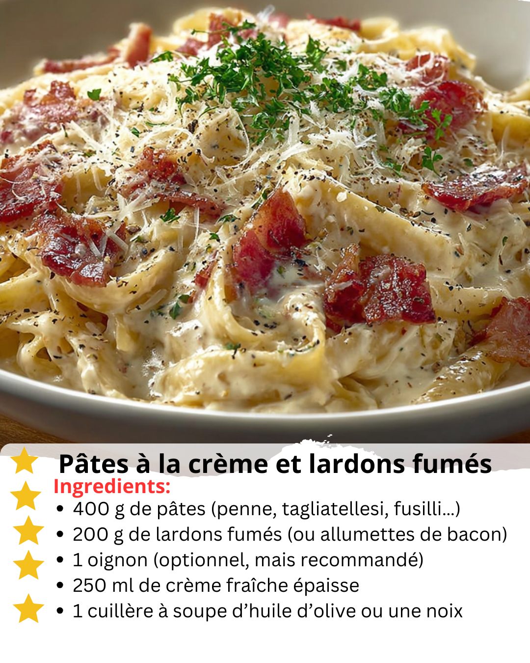 Un plat rapide, délicieux et toujours apprécié Temps de Préparation Total Préparation : 10 minutes Cuisson : 15 minutes Temps total : 25 minutes Portions : 4 personnes Ingrédients  Ingrédients principaux : 400 g de pâtes (penne, tagliatelles, spaghetti, fusilli…) 200 g de lardons fumés (ou allumettes de bacon) 1 oignon (optionnel, mais recommandé) 250 ml de crème fraîche épaisse (ou crème liquide entière à … Read more