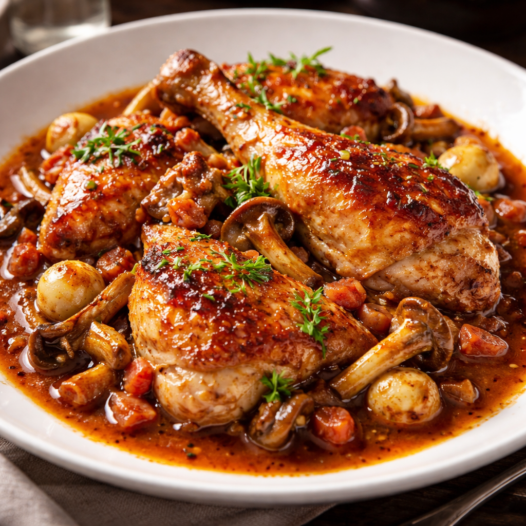 Ce plat est une version raffinée du célèbre Poulet Chasseur, caractérisée par des morceaux de poulet à la peau croustillante, nappés d’une sauce intensément parfumée à base de vin blanc, tomates et fond de veau.