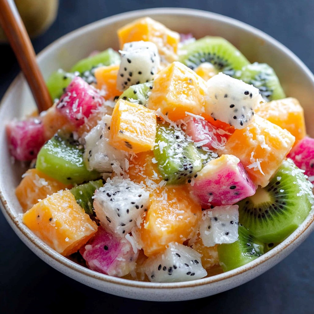 Cette salade de fruits exotiques est un dessert léger, rafraîchissant et vitaminé, idéal pour terminer un repas en douceur ou pour une pause saine et gourmande. L’association du pitaya, du kiwi et de la papaye (ou mangue) apporte un équilibre parfait entre douceur, acidité et exotisme, sublimé par la noix de coco.