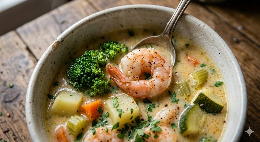 Imaginez une soupe chaude et parfumée, où chaque cuillère révèle un mariage parfait entre légumes frais croquants et crevettes tendres légèrement épicées. La douceur des carottes et des pommes de terre se mêle à la légère amertume du brocoli et à la fraîcheur de la courgette, le tout enveloppé dans un bouillon parfumé aux herbes de Provence. Les crevettes, délicatement cuites, apportent une touche marine qui rend cette soupe à la fois légère et rassasiante. Un filet de crème ou de lait de coco vient couronner le tout pour une texture onctueuse, veloutée et réconfortante. Cette soupe est parfaite pour les soirées fraîches, les déjeuners sains, ou même pour impressionner vos invités avec un plat simple mais raffiné.